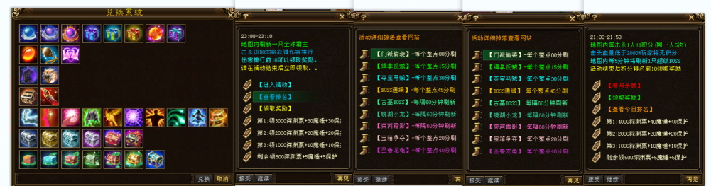 - 【BOSS大本营】:转生丹。转生丹·碎片。深渊·门票(单)。深渊·门票(特)。幸运魔锤·碎片。增幅保护卷·碎片。宝石宝盒。怪物卡片·宝盒等等!